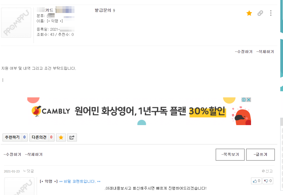 반전이라면 반전이겠지만 상당히 매력적인 조건이었음에도 불구하고 저는 뽐뿌를 이용해 카드 발급을 하지 않았습니다. 가장 큰 이유는 개인정보였습니다.